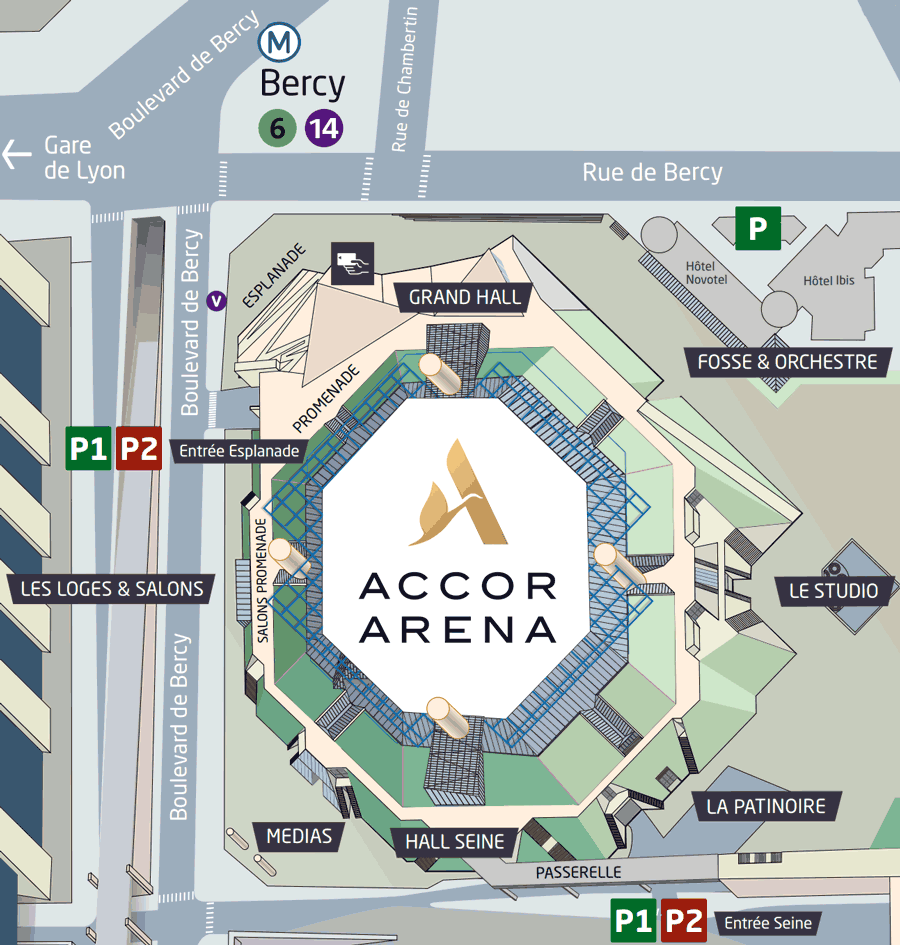Voici la situation des différentes entrées de l'Accor Arena.